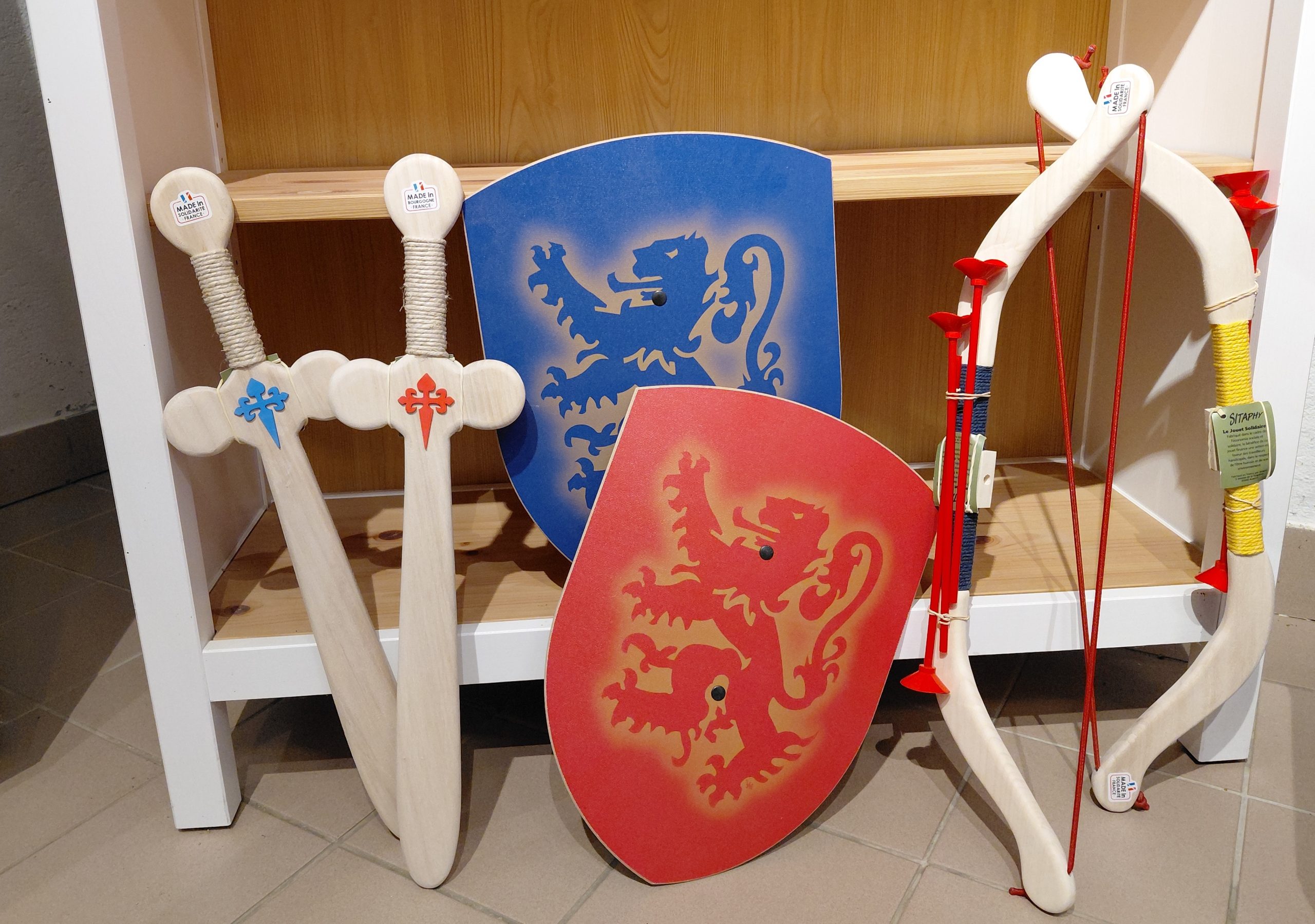 Figurines, jouets en bois, jeux de société et livres ludiques… offrez aux enfants (et aux adultes !) un souvenir qui invite à rejouer l’aventure médiévale à la maison.